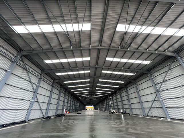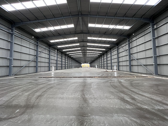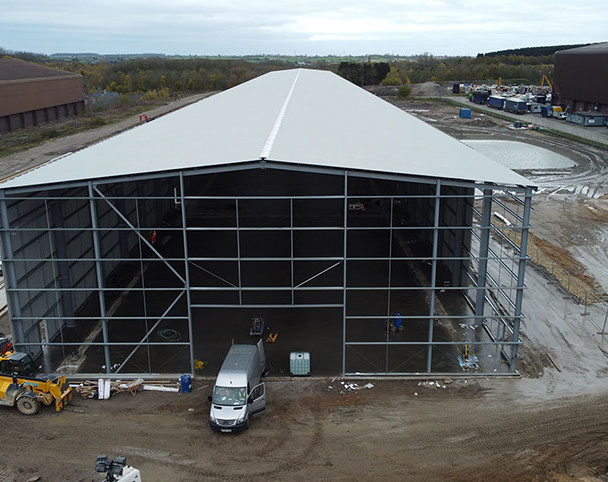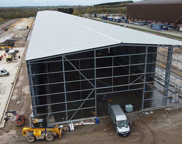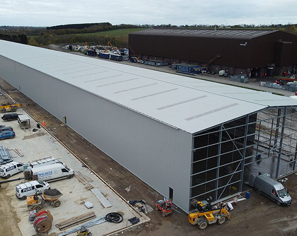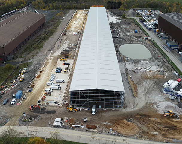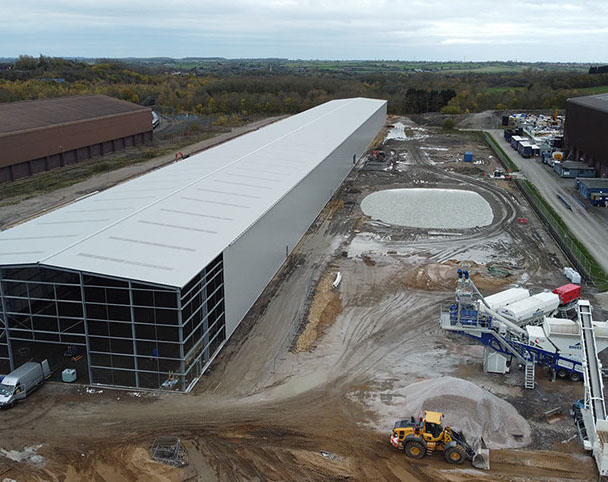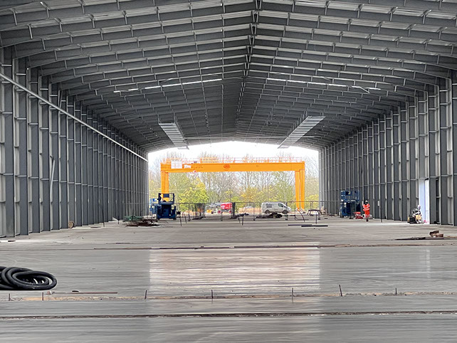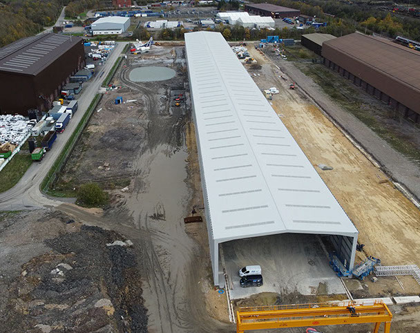 The construction of a 365m long steel framed production building complete with the infrastructure for an on-site concrete batching plant. Continuous reinforced concrete crane beams were constructed for heavy duty traveling cranes operating within the building and the external storage area.